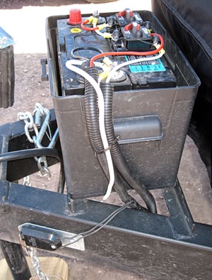 Much nicer. The splice in the main power line that was put there by whomever originally stuck that silly inline fuse before the battery (see the PROBLEMS section) was now all sealed up and inside the conduit. The conduit ran up into the battery box and ran all of the way back under the trailer until the wires went up through the floor. The emergency brake wires were safe, unless the trailer flipped over in which case the emergency feature of the brakes wouldn't do much good anyway. I think the roof will bring the trailer to a safe stop.