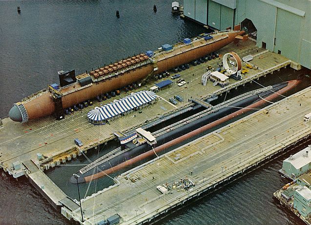 After nuclear power school and prototype I was sent to the fleet and assigned to a submarine. My "boat" (submarines are not called "ships") was the Ohio (SSBN-726). I was part of the pre-commissioning crew, and then the Gold crew once construction of the boat was completed and control of it was turned over to the Navy. Above is a picture of the Land Level Facility at General Dynamics' Electric Boat Shipyard in Groton, Connecticut. The submarine in the water was the Ohio. The boat on the pier was the Michigan. It was the second boat of the Ohio Class of Trident submarines. This picture was taken in 1979 for the keel laying ceremony of the third Trident submarine. At this point it was known as the "28 boat", and was no more than the round ring you see on the pier between the two boats. It was eventually named the Georgia (SSBN-728). While the Ohio looked like it was ready to go it was actually two more years after this picture was taken before it went on its first sea trial. The ants in the picture are people.