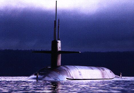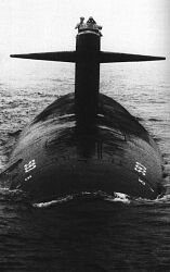 Above is a picture of the Ohio in July of 1981 during its first of three sea trials. The white "targets" that were painted on the deck were there to help the pilot of a Deep Submergence Rescue Vehicle (DSRV) find the three hatches into the boat in the event that we were to sink, which, of course, was entirely possible since this was the first time that the boat, or any U.S. boat of this size, had been at sea. You can't see me, but I was in the boat way back in the engine room, waving while this picture was being taken.
