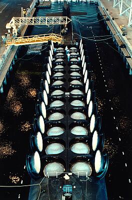 Above is a picture of one of the subs in port, and in the 'garage' where missiles could be loaded and unloaded. Even with the hatches open you couldn't see the missiles themselves -- if there were any. Each missile tube was covered with a fiberglass dome that kept the water out of the tube until a split second after the missile launch sequence got to the good part. Just before the missile bumped into the dome as it was being jettisoned out of the tube, explosive cord in the fiberglass broke the dome up into several pie-shaped wedges. The missile then continued on its way to the surface where, after it was fully clear of the water, the engine ignited, and the missile and its warheads (if it had any) proceeded on to ruin someone's day.