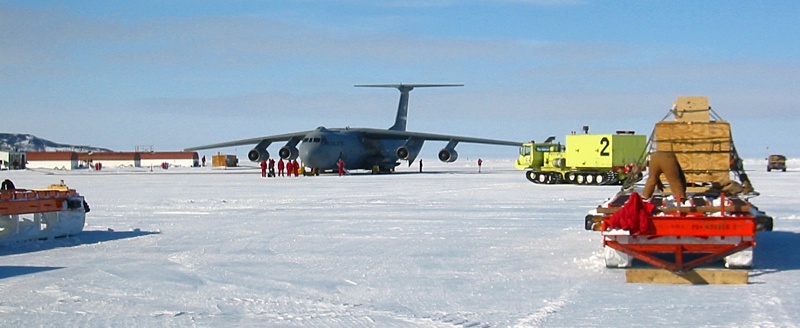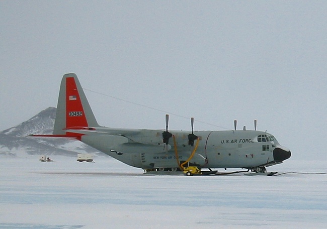 An LC-130 Hercules with skis (that's what the "L" stands for -- don't look at me...I didn't come up with it). These made flights between New Zealand and McMurdo, as well as between camps and bases on the continent. The C-141's required a perfect ice runway. The C-130's were able to land on not-so-perfect runways, so they got around more.