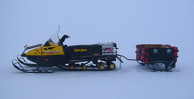 A Ski-Doo Skandic. We used eight of these and two older Ski-Doo Alpine 1's for our expedition. The Skandic's were brand new. They had about three miles on them when we got hold of them.