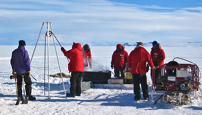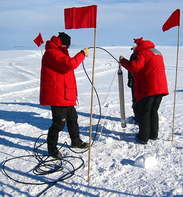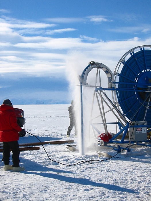 Two other items were built specifically for this experiment. Above is the hot water drill. Most of Antarctica is covered with ice thousands of meters thick, so if you need to drill a hole you can just use hot water to do it. Snow was shoveled into the black tank in the middle of the picture where the steam is rising. An initial quantity of water was heated by the unit on the right and pumped around and back into the tank to melt more snow. Adding snow to the tank and melting it continued until there was a tank full of hot water. The hot water from the tank was then redirected through the hose on the left and to a long metal spout which sprayed the hot water out of its tip. This was slowly lowered down into the ice to drill the hole.