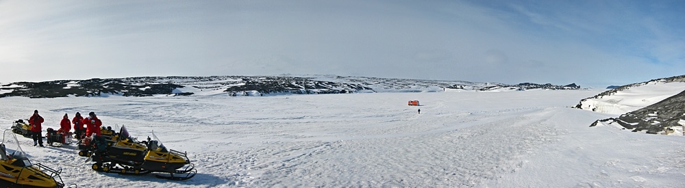 Above is a picture looking south from the hill south of Shackleton's hut. A small iceberg from another season is trapped in the ice in the foreground. Inaccessible Island and Tent Island are in the distance above the iceberg (from this angle they run together). I'm not sure how Inaccessible Island got its name, but as we went by on our Ski-Doo's you could see that the island came straight out of the water. There was no discernible place to land a boat.