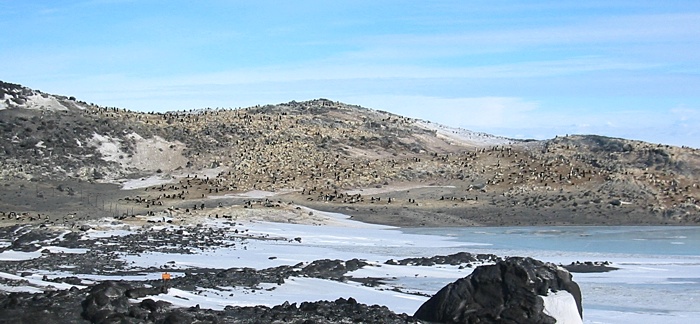 The tan-colored hill on the left in the picture of Blue Lake, Flagstaff Point, was populated with Antarctica's favorite bird -- penguins -- seen in the picture above. Later in the season the Ad?lie penguins here, and in other rookeries, began abandoning their eggs and heading north to open water. The 2002-2003 Summer was a bit colder than normal and the sea ice failed to break up around Ross Island. The penguins couldn't stay, because they couldn't get to where the fish were, so they had to leave. The same thing happened in the 2001-2002 season.