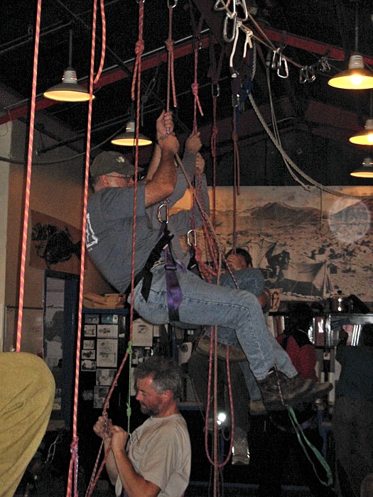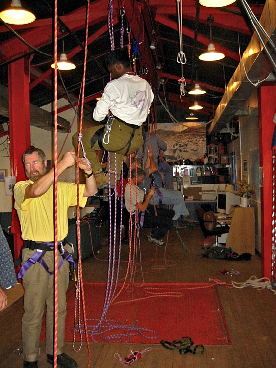The training was conducted by our two mountaineers, Ash Morton and Peter Braddock. The first portion of the training was indoors and it covered things such as how to get yourself up and down a rope without hanging yourself or kicking the crap out of the guy hanging there next to you.