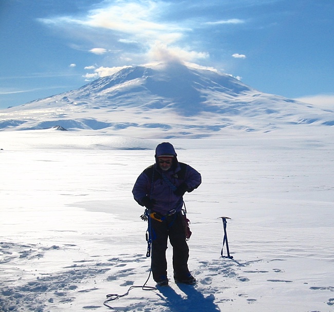The scenery was pretty hard to take. That's Mt. Erebus behind Peter in the picture above. There was little or no wind at the summit, so the plume from the volcanic activity just hung around the top of the mountain all day.