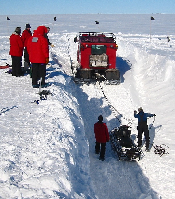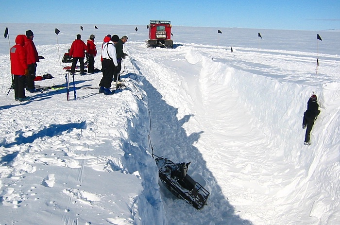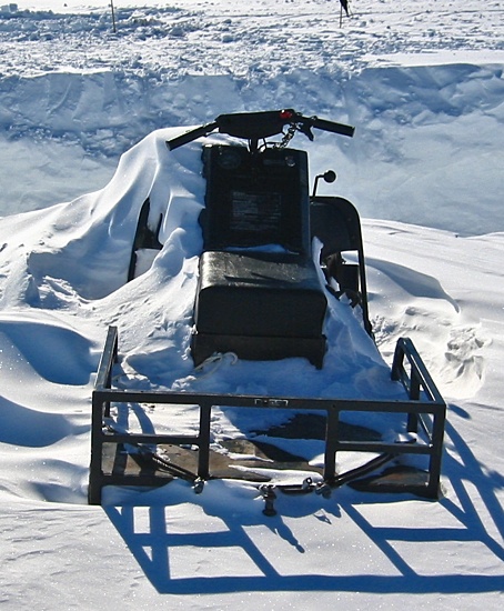 Since we were going to be doing a lot of traveling on snowmobiles, we thought we would give the extraction of a snowmobile from a crevasse a try. An old snowmobile was at the training area for just that purpose.