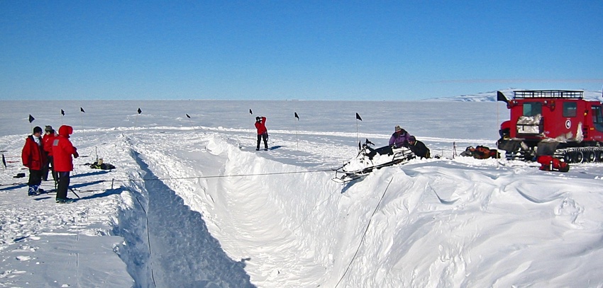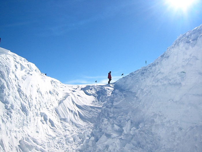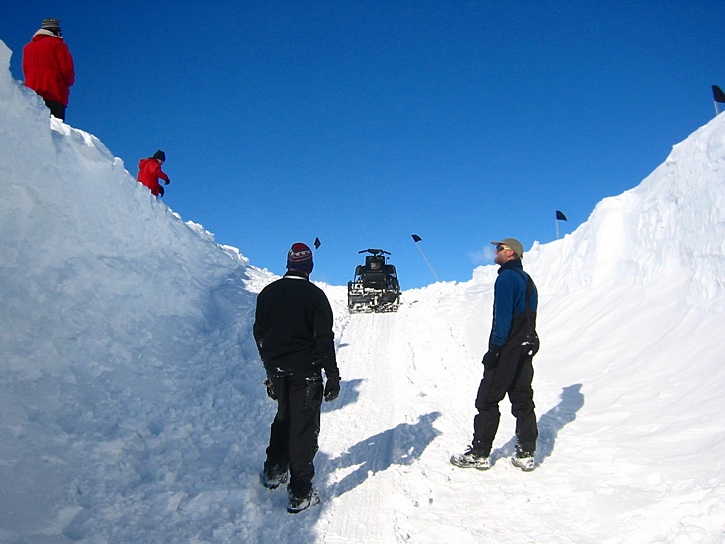 After quite some time we decided that actually pulling the snowmobile all of the way out by hand was beyond the scope of the course. We ended up backing the PistenBully into the crevasse and towing the stupid thing out.
