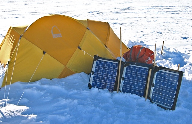 The mountain tents came in two varieties: Plain, and wired. I used one of the large batteries and a solar panel array to power my IBM ThinkPad laptop in my tent so I could work on these web pages, listen to music, and to power my Christmas tree lights. OK, so I didn't really have any Christmas tree lights. First off there were no trees, and second with the sun being up all of the time Christmas tree lights wouldn't have worked very well even if I had brought them.