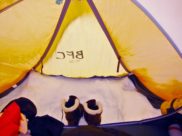 The inside of a mountain tent was large enough for your sleeping bag covering one side and the middle of the floor, and all of your stuff covering most of the remaining side. They also had a vestibule entrance where you could dig a boot pit which made it easier to get into and out of the tent. If the snow was piled around the outside of the tent properly so that there were no wind leaks the temperature inside would get up into the 20's Celsius (70's Fahrenheit) when the sun was out. On those nights when you knew it was going to be cold you would fill a 1-liter Nalgene plastic bottle with hot water, take it to bed with you, and either put it down by your feet or hug it like a teddy bear. If you had at least two sets of things like socks and boot liners, and you left one set hanging in the tent during the day, they were quite dry and ready to wear the next time their turn came up. I also used the boot pit as a place to do things like wash my hair every few days with the evening's liter of warm water, which would still be almost hot in the morning. The advantage to doing this in the tent was that you could get around to drying your wet hair without it being frozen stiff before you could begin drying it.