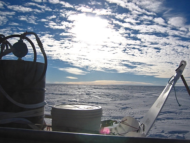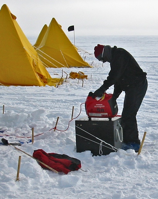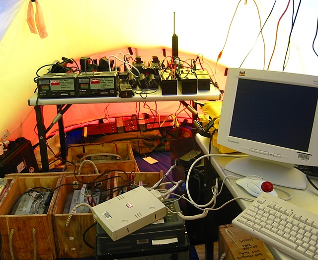 ...a few dozen rechargeable batteries ranging in size from AA's to 100Ah gel cells for everything from handheld GPS units to RADAR units to seismic recording systems, two or three Iridium satellite phones, eight or ten VHF radios, CD writers, PDAs, computer video monitors, video cameras, digital cameras, electric razors, soldering irons, shot boxes, and I don't know how many laptop computers. Apparently you need more than a field notebook and a pencil to do science these days. The one thing we didn't have (other than small flashlights) were any electric lights. The sun is up 24 hours a day during the Austral Summer, so we never needed them.