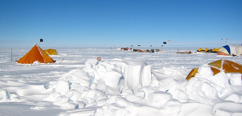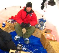 The pointy tent on the left was your standard outhouse setup. There was usually a can with plastic bags inside and a regular toilet seat on top made out of a blue insulating foam material that did an EXCELLENT job -- even at sub-sub-freezing temperatures. If you live where it gets cold I think you know what I'm talking about. If we were going to be somewhere for a while then a hole was drilled down several meters into the snow with our hot water drill and the toilet seat was placed on the snow over the hole. The black flag was our signaling system. If the flag was up then the coast was clear. If it was down then the tent was occupied...or someone forgot to put the flag back up, for which they were duly chastised.