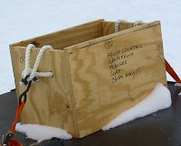 The basic unit of field camping packing was the rock box. Just about anything that would fit could be found in rock boxes. They were sturdy plywood boxes with a rope handle on each end. The lids were usually held on with two screws. They were used for food, batteries, explosives, tools, birthday presents, and as furniture. Why "rock box"? They were also used as shipping containers for geological samples --- rocks -- which we didn't see any of on our trip. All of the rocks in the area where we were working were under about two kilometers of ice.