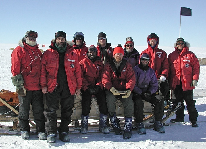 Above is the required group shot. You see a lot of these kinds of pictures around McMurdo, and oddly enough everyone is dressed about the same. This was the group that went the distance. It was taken during our final days of work at Onset-D. From left to right: Don Voigt-Penn State University, Anatoly Mironov-University Of Texas at Austin, Ash Morton-British Antarctic Survey, Shridhar Anandakrishnan-Penn State University, Paul "Snuggle Muffin" Winberry-Penn State University, Matt Nolan-University Of Alaska at Fairbanks, Peter Braddock-independent mountaineer, Andy Smith-British Antarctic Survey, Leo Peters-Penn State University, and Me-IRIS/PASSCAL. That's a flag pole coming out of my head, and not an antenna. I should have Photoshopped that thing out of there.