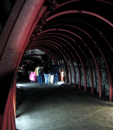 Out of the many, many kilometers of tunnels a cathedral was created by the miners and opened to the public in 1954. The old cathedral that was built in an older portion of the mine was closed over safety concerns as the condition of the mine deteriorated. The new cathedral was started in 1991 and mostly finished and opened in 1995. There is still some construction going on. Above is the tunnel near the entrance.