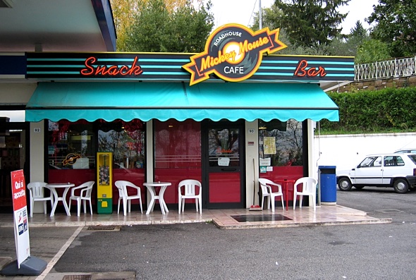 After another short flight across the Atlantic Ocean (after years of flying across the Pacific Ocean, for both business and otherwise, flights across the Atlantic seem pretty short to me) the adventure began in Rome, or when in Rome, Roma. The "Mickey Mouse" cafe and snack bar in the picture above was at a gas station. A "bar" in Italy isn't quite the same as in America. You can get your favorite beverages and snacks there, but you can also pick up a loaf of bread for dinner. They are also mostly geared towards standing at the counter while you drink or eat your snack. There are usually no bar stools, so I guess they are not meant to be places to go, relax, and drink yourself silly after work. Italians eat slowly, but apparently snack quickly.