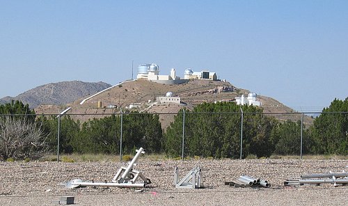 The area where we worked was a bit out in the boonies along with a lot of the other projects and work sites on Kirtland AFB. Below is a picture of the Starfire Optical Range complex taken from where we were working. It is a collection of telescopes and high-powered lasers. The original idea behind the facility was to use the lasers to create what looked to the telescopes like stars, then adjust the optics of the telescopes in real-time to correct for the distortion of the laser's "star" image caused mostly by atmospheric turbulence. Correcting for the turbulence would allow the telescopes to see very fine details of objects in space. The technique is generally called adaptive optics. There are now civilian telescopes that apply the technique to obtain better images of real stars. If we had known what they were up to these days at the Starfire Range they would have had to have shot all of us.