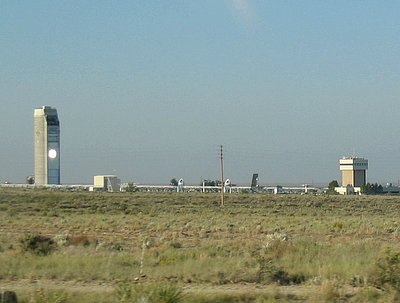 Another one of the large facilities that we drove past everyday was the Solar Power Tower. You can't quite see them in the picture below, but there was a large collection of mirrors of various shapes and sizes between the tall tower on the left and the smaller one on the right. These mirrors could be commanded to track the sun and reflect the sunlight at the tall tower. You can see the round, bright spot halfway up the tower. This was where at least some of the mirrors were shining. The point of all of this was to have all of the mirrors concentrate the sunlight in one spot near the top of the tower, use the energy to heat a liquid, and then use the resulting steam to produce electricity. Of course you could also probably use all of that heat to do other things, but if we knew what that was they would have probably had to have shot all of us again.