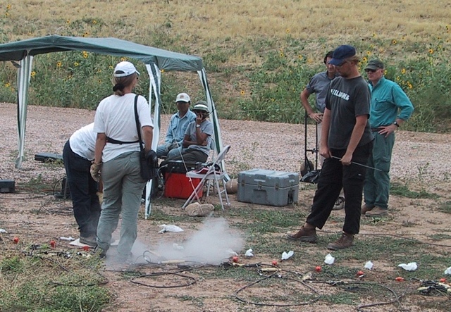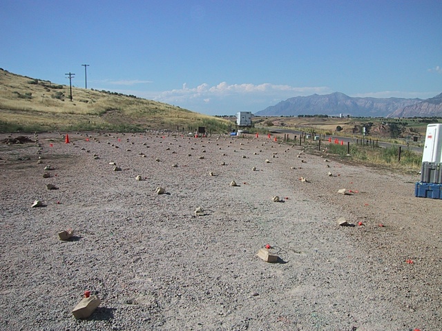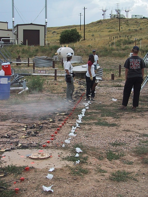 When the entire field of play had been covered by the six rolling rows of Texans a different type of experiment was performed. This time the 600 Texans were all spread out so as to cover the entire area of the experiment at the same time as seen in the photograph below. The Texans were programmed to record data for three seconds, every 30 seconds, 999 times (a little over 8 hours). Every 30 seconds a shot was made next to a Texan. If the shot was good then the gun was moved to the next Texan and the shot made there, and so on until a shot had been made next to all of them.