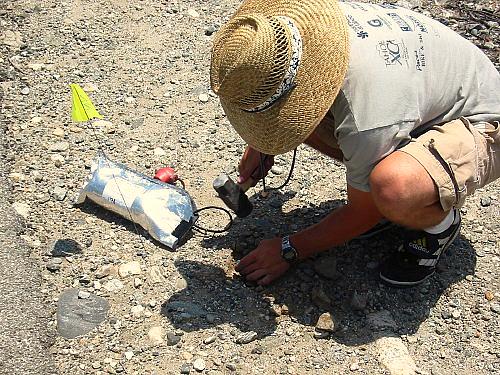 The conditions of the ground over the whole line varied from concrete to beach sand. The ground along the bike trail was, for the most part, packed gravel, so sometimes it needed a little persuading to allow the spike on the geophone to be planted. Wes Thelen from UNR is using a cold chisels and a small sledge hammer below.