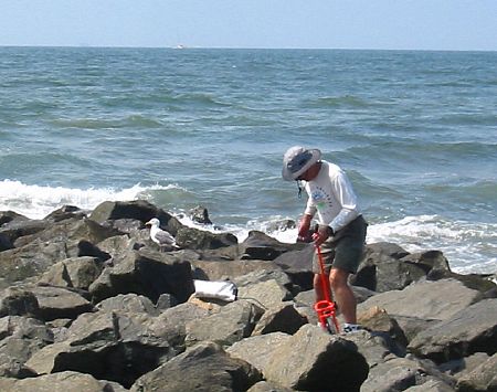 Unfortunately we couldn't stop Jim Scott of UNR. He just kept on measuring until he ran into this seagull. Luckily he was able to find cracks between the large boulders of the jetty to jam the geophones into, and get them fairly level. He was able to deploy two more Texans beyond the one on the beach in the picture above.