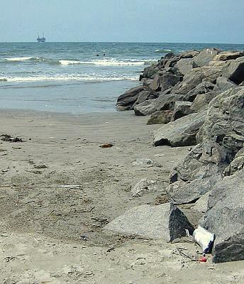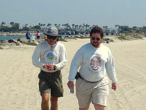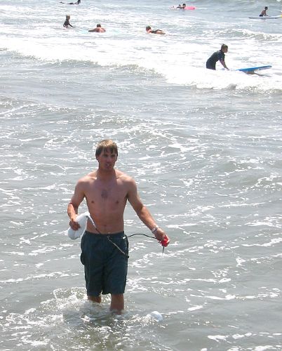 Some crazy scientist from UNR, that was in charge of the project (and who shall remain nameless), thought it would be interesting to place a couple of Texans and their sensors beyond the end of the jetty and into the ocean. Me, being young and naive, went along with the idea. One of the Texans was double bagged in plastic (they are waterproof, but we weren't sure about them being submersible), and was told to hold its breath. Wes jumped into the ocean and gave deploying the Texan the ol' college try, but couldn't get the geophone to stay planted in the sand. The water off the end of the jetty was much deeper than it was where he was statnding in the picture below. The surf, which was a bit heavier than it was the day when they were there surveying and came up with the idea, caused the Texan to slosh back and forth which made keeping the geophone planted even more impossible. With the right equipment, like some SCUBA gear and some rocks, we could have made it work.