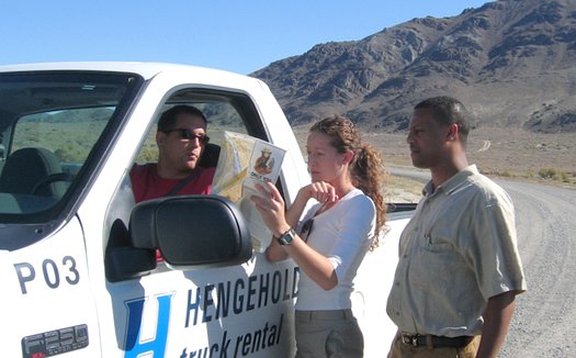 While there wasn't a whole lot of stuff in the area there were certainly a lot of dirt roads running around, and they all looked about the same. We all had GPS receivers as guides for the deployment teams and to record instrument positions, so we managed to not really "lose" anyone, but there was a lot of map-looking going on in the beginning. Below was during the first day. Julie Fosdick of Stanford, Ewnet Gashawbeza of Ethiopia via Stanford, and I stopped to check with Charlie, who had helped survey the line to make sure that we were headed in the right direction. We didn't want to put instruments out in the wrong place and look like complete idiots on our first day.
