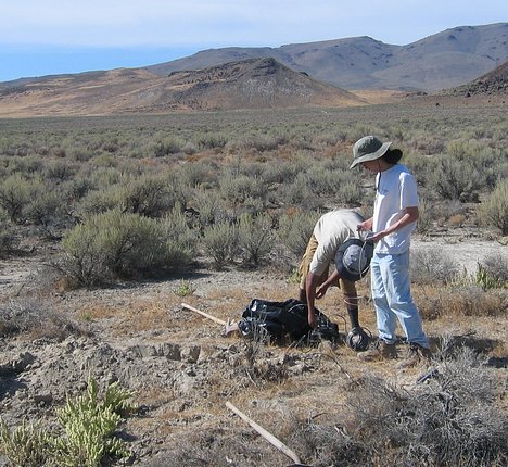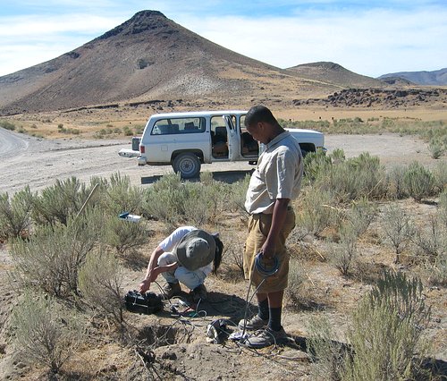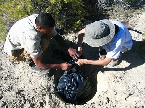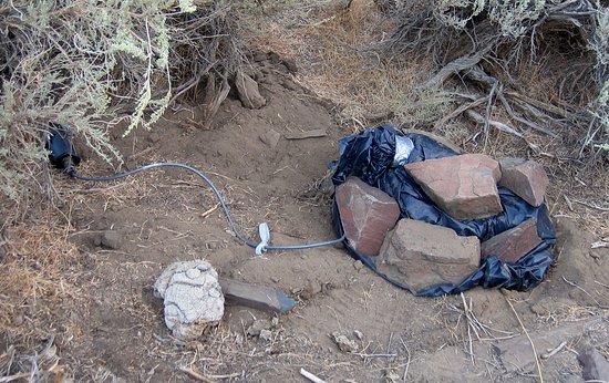 Sometimes the dirt was so hard we weren't even able to scratch out more than a small depression for the recorders and the batteries. The plastic bag just had to be left exposed, but hidden in the middle of some bushes. All of the stations were within 25 feet of the main road."Main" being a relative term out there in the wilderness.