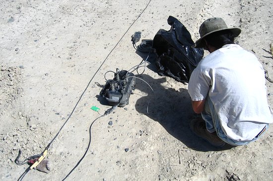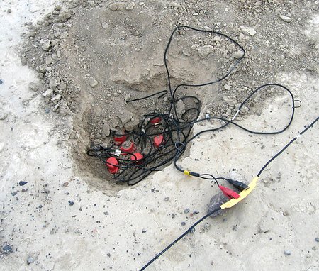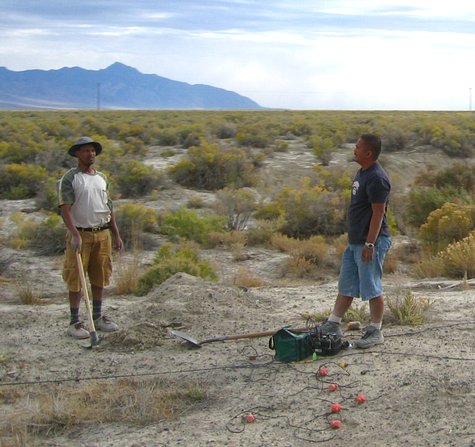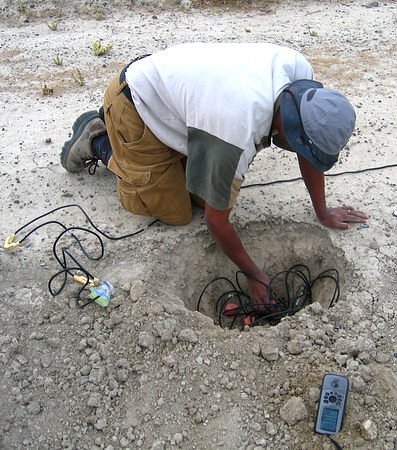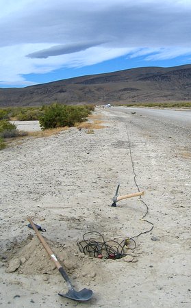 Walking, a lot, and getting the cables where they belonged was only part of the fun. Four holes had to be dug for each cable. One for each group of sensors, and one for the recorder and its batteries. When that was finished the sensors had to be untangled from themselves then pushed into the dirt and leveled. Once that was done the two people installing the sensors would coordinate through hand signals with the person getting the recorder running. Once it was verified that the geophones were functioning they were covered up, the recorder was started and buried, and everyone moved down a thousand feet to repeat the process. The ground was just hard enough to make a pick axe necessary for digging. That merely added to the excitement.
