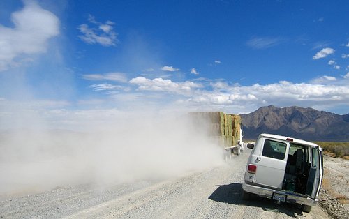 When it was operating it kicked up quite a cloud. The frequency"sweeps" started out at a very low frequency that shook you and all of the plants in the area and that slowly climbed in frequency. A sweep lasted about 20 seconds. When everything at one location was finished the orange foot was lifted and the truck moved about 500 feet down the deployment line to repeat the process. I hope Hertz doesn't notice my rental car there.
