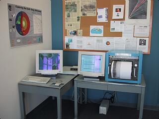 Near the building entrance is a display of up-to-the-minute seismic activity around the world measured by the Global Seismic Network (GSM). The GSM is also part of IRIS. The blue colored piece of equipment on the right is a real-time seismograph that records data coming from a station in Alaska.