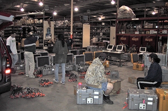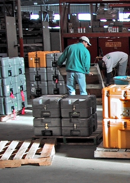 When the data download from a set of Texans was finished the Texans were disconnected from the transcase, the bottom removed, and the two D-cell batteries taken out. This made them lighter for shipment. The Texans were then placed back into the transcases which were stacked on pallets for shipping back to Socorro. As the last sets of transcases finished downloading the bridge computers, monitors, power supplies, and associated cables were packed up and also strapped to the pallets.
