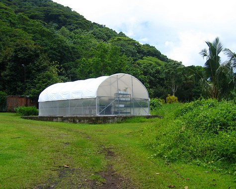 Another possible place we thought might be good was near the green houses. We thought it would have been really convenient to have put the sensor on the far side of this building, put the recoding equipment box inside the building, and just run the cables under the wall between it and the cement slab. Then we found out that the buildings like this one are sometimes dismantled before tropical cyclones. Plan B?
