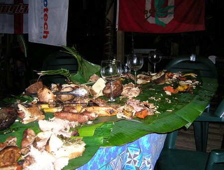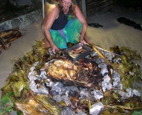 A few dozen rocks are heated with fire in a shallow depression in the sand. After the fire goes out the hot rocks are covered with a layer of leaves, a layer of food and spices, and then a lot more leaves. Below is the umu with the top layer of leaves removed. Chicken, pig, lamb, taro, cooking bananas, squash, fruits, you name it and it was in there and cooked -- closer to steamed -- to perfection in just a few hours. That's Candyman nabbing the food. He was an ex-road construction guy from New Zealand and was the man of the bar.