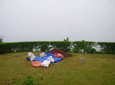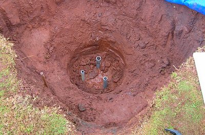 In between showers we were able to do a little more prep work. A 35 gallon barrel was going to be placed into the hole with a bunch of cement, so I stuck three pieces of PVC tubing into the bottom of the hole and pounded them down until a marble tile placed on top of them was level and about six inches above the bottom of the hole. These tubes were put in to give the barrel something relatively level to settle down on top of when we got around to installing stuff.
