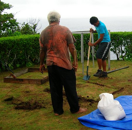 During another break in the weather Lafaele and his helper, Tuiala Usoalii, who was the son of the local chief, started laying out a spot for a cement pad that would, eventually, hold the box containing the recording equipment and the solar panels. The preliminary solar panel mount is in the background.