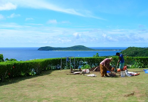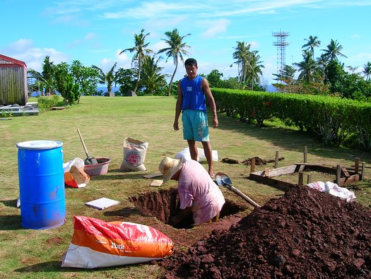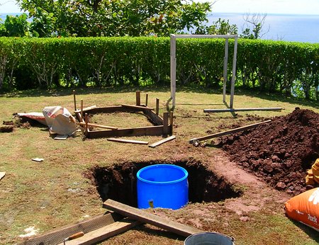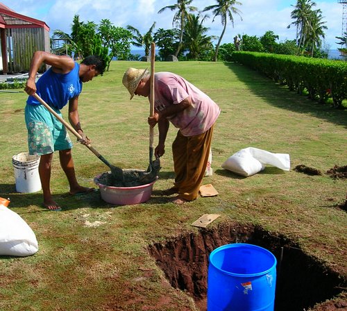 This was how we left the station. It took almost a week to get this first station to this point. The first one is always the most difficult. A couple of days before this Matt and Shaun went on to the island of Ta'u to get things moving there. With the technically difficult part of getting the barrel planting finished -- it had all been just a theory up to this point -- it was time for John and me to head for the island of Ta'u. There wasn't much left to do here but finish the cement for the pad, watch all of the cement dry and fill the hole back in around the barrel.