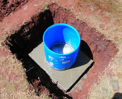 Voila! The cement work for our first station was finished. It took about two hours to finish up. The theory was that the barrel was sitting in a large chunk of cement, and it was also partially filled with cement all in the interest of stability and what is called coupling. A table with one short leg will wobble around if the floor shakes (like in an earthquake). It is not coupled to the floor very well. In order for the sensors to be at their best they need to be well coupled to the ground and shake along with the ground when there is an earthquake.