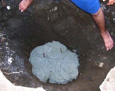 A hole was knocked in the bottom of the cistern and a hole dug down into the dirt. The site looked good...as good as we were going to get with the amount of time we had. The soil was a mix of dirt and just enough rocks to be really annoying, but good for stability.
