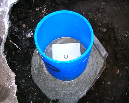 When we were finished the barrel and cement construction looked just like the NOAA site, except that the dirt was a different color. The white square in the barrel was a marble tile which was about one inch thick. It was placed on top of the wet cement and it sank to about half of its thickness into the cement. It was also leveled with the bubble level sitting on it. The tile was there to provide a harder surface for the sensor feet to rest on.