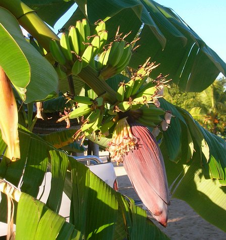 The picture below is just in case you've never seen where bananas come from. No -- storks don't bring them like they do babies. Each banana tree has one stalk that starts growing up, but then bends toward the ground as the weight increases. The black tips on the ends of bananas (where you hold them as you peel them) is what is left of a flower blossom. The blossom has dried up and fallen off of the bananas near the top of this stalk, and are the only evidence that there is going to be a banana down near the big red thing. The big red thing, in the Philippines, was called the "heart of the banana". It's kind of a blossom for the whole stalk. It can be chopped up and cooked like cabbage. It's quite good. So are the bananas. Bananas eaten fresh from the jungle taste much better than any ones bought in a supermarket.