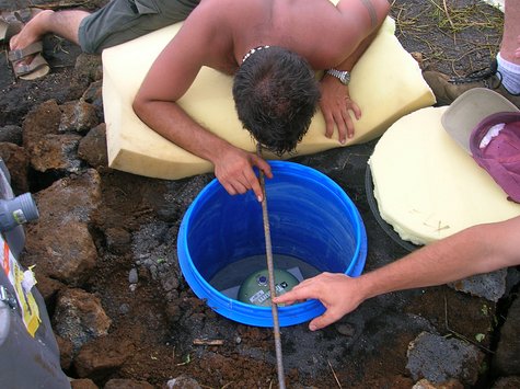 The next day we were able to backfill the hole around the barrel and build up the ground level a bit to make up for not being able to get the barrel down quite as far as planned. We used the large rocks we'd thrown out during the previous days, some imported sand from down the beach, and cement to build the mound.
