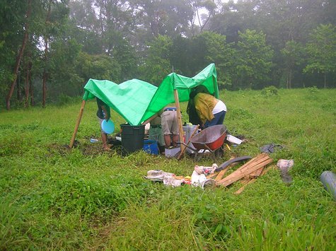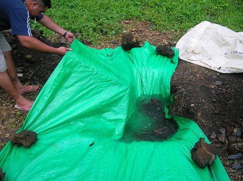 We were huddled under our tarp trying to get organized when Sooalo Tito Alatimu ("Tito"), the head of the field office that had come up with us to see what we were doing, started looking at us funny. Even though the area was a bit remote we were under the impression that it was fairly secure. Tito set us straight. The site wasn't in the middle of a high crime area or anything, but there was a village nearby, and the locals used the roads that ran by the field to get around. Tito felt that a setup similar to the other sites, where the equipment basically just sat out in the open with a bit of a fence around it, wasn't one of our best ideas. We just didn't know the area was so popular. After a bit of discussion -- mostly a lot of saying "yes"-- we decided to finish up backfilling the hole around the barrel, pack everything back up, and figure out what to do next.