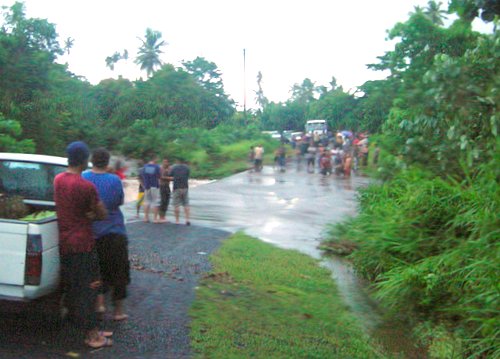 It didn't dawn on us while we were getting soaked to the bone at the site that it was raining all over the island, and when it rains all over the water has to go somewhere. A whole bunch of it made its way back to the ocean right across our path back to the resort. In one of the bridgeless places a river that ran from high up in the mountains in the middle of the island down to the coast near Sasina kept us stopped for about an hour. It was nice to finally get back to Tanu that night. We'd been cold and wet all day. They kept some supper ready for us.