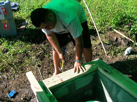 The next day was really nice, which meant it was going to be hot out in the open. We loaded our equipment and the top for the site onto the trucks and headed back up the hill. The top ended up weighing about 80 pounds. The lumber there was not made out of cheap pine wood. It was all some form or another of hardwood.