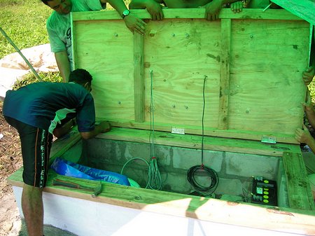 Hinges. Pretty fancy for the jungle. The two wires coming out of the plywood were from the solar panels. There was also a small third one from the GPS antenna that was mounted between the panels on top of the lid.
