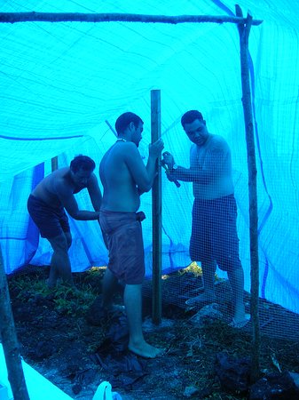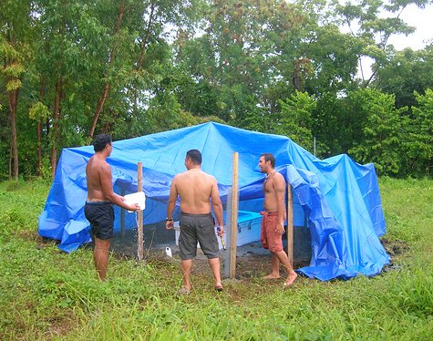 Luckily Matt bought a HUGE tarpaulin when he and the guys were picking up the supplies for this site that we used to build the great wall of Asau. The tarp was large enough to cover the whole site which was handy since it was raining all over the whole site and all over us.