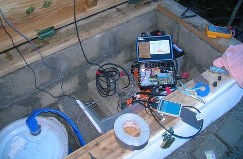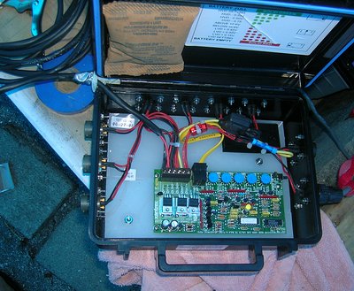 Looking over the wiring showed that one of the wires from one of the solar panels was broken right at the connector. These connectors cannot, stupidly, be repaired in the field unless you have a bunch of little parts and some special tools with you, so I chopped the connector off, cut a hole in the upper left-hand corner of the power box, and wired the solar panel directly into the charge controller circuit board. You can see the wire entering the upper left-hand corner of the box. It was held in place with, what else?, duct tape.
