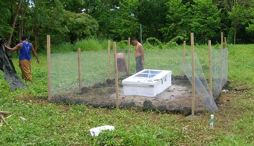 Not too bad for a bunch of city-boys. We put a bunch of rocks around the bottom of the fence to try and keep the animals out. Three and a half stations finished. One half to go.